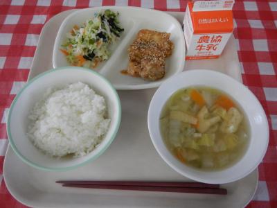 2023/12/19 ご飯、鶏肉のごまからめ、わかめの酢の物、白菜のみそ汁