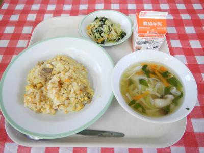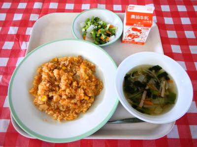 2023/12/8 ジャンバラヤ・牛乳・カリポリサラダ・コンソメスープ