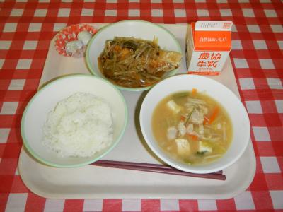 2023/12/14 ご飯、牛乳、手作り豆腐ハンバーグ、ゆかりあえ、ネギのみそ汁