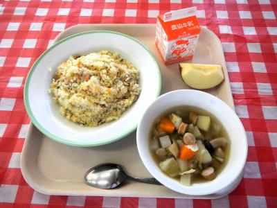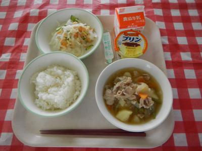 給食の肉じゃがは、汁物扱いで、汁を多めで作ります。