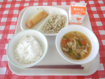 2023/11/21 ご飯、牛乳、ルンピア(春巻き)、ギニサントゲ(フィリピンもやし炒め)、ポークシニガンスープ