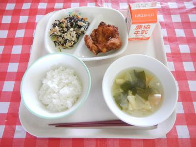 ごはん、牛乳、若鶏の塩麹から揚げ、炒り豆腐、大根の味噌汁