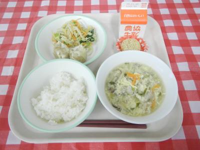 2023/10/27 ごはん、牛乳、焼売、もやしナムル、サンラータン、揚げごまだんご
