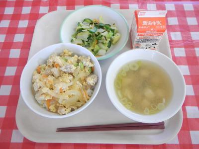 2023/10/30 親子丼、牛乳、昆布和え、豆腐の味噌汁