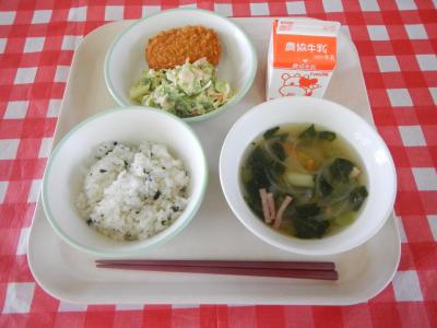 2023/10/31 わかめご飯、牛乳、かぼちゃコロッケ、ブロッコリーのサラダ、コンソメスープ