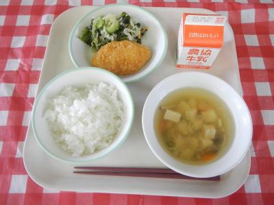 2023/10/13 ご飯、牛乳、手作りかき揚げ、ごま和え、すまし汁