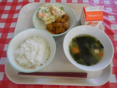 2023/10/17 ごはん、牛乳、ミートボール、ポテトサラダ、わかめの味噌汁