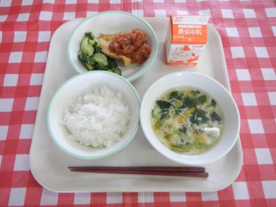 9/15 〇きゅうりの日 ごはん、とりのチリソースがけ、華風きゅうり、たまごのスープ