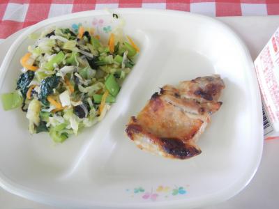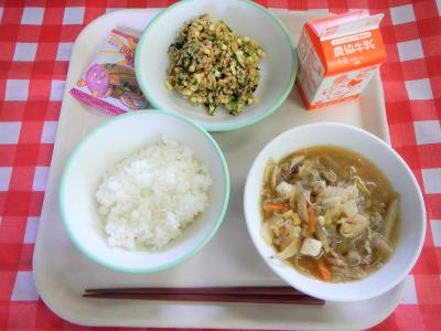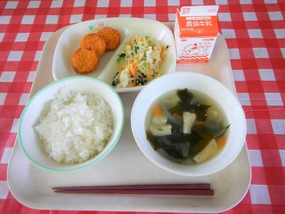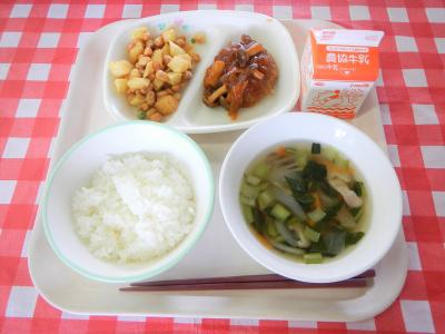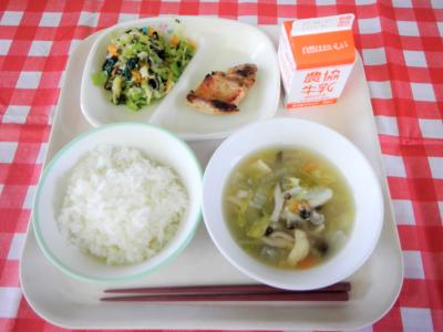 2023/6/12 ごはん、牛乳、鶏肉の梅焼き、磯香和え、白菜のみそ汁