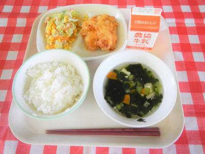 2023/5/23  ごはん、牛乳、とり天、ちくわの酢味噌和え、みそ汁