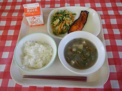 2023/5/26 小松菜豚丼、牛乳、あっさり漬け、もやしのみそ汁