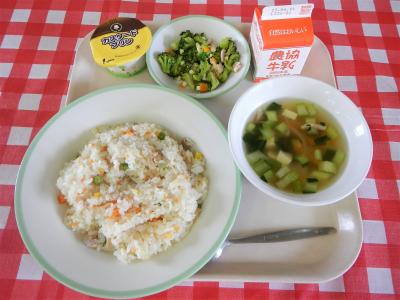 2023/5/25 キャロットピラフ、牛乳、ブロッコリーのサラダ、コンソメスープ、プリン