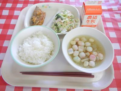 2023/5/30 ごはん、牛乳、さばのカレー揚げ、ごまマヨサラダ、まり麩のすまし汁