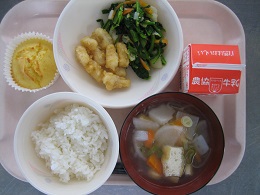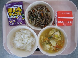 紫いもチップスもとても人気があります。あちこちから、カリカリポリポリと噛む音が聞こえました 今日もお残しゼロでした