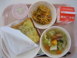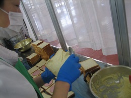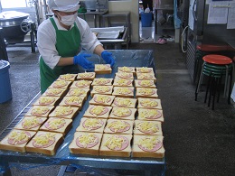 ホワイトソースを作り、パンに丁寧に塗ります(すみずみまで塗るのがコツ)ロースハムを1枚のせ、その上にとろけるチーズをかけ、スチームコンベクションでこんがり焼きます仕上げにパセリをふって、パン用の袋に入れて配食しました全員残さず食べていました