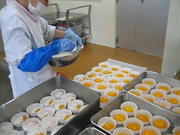 今日は、紙カップに半月に切ったハムを一枚一枚入れて、卵をのせ蒸しました。「卵の黄身が苦手~」と言いながらみんな食べて行きました。今日も、おいしかったですね。