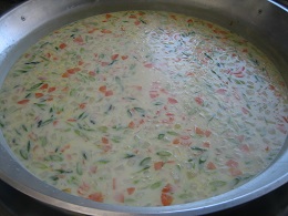 春雨スープは、春雨、キャベツ、にんじん、とりささみであっさりとした味に仕上げます。すぶたとの相性バッチリです