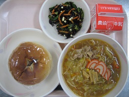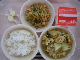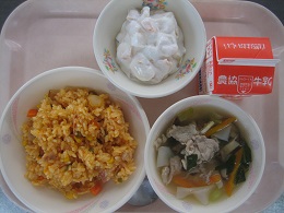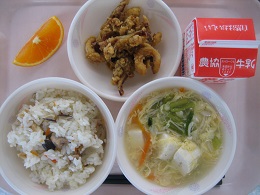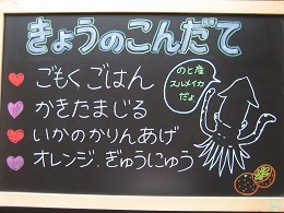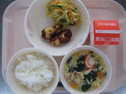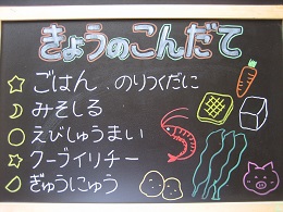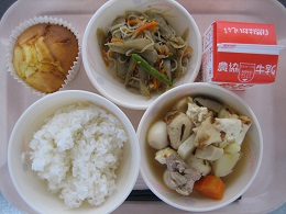 今日は、細切りのすき昆布をもどしたものと、豚肉、しいたけ、にんじん、たけのこ、油揚げを使って作りましたしいたけのだしがきいておいしくなっていました。 全員残さず食べていました