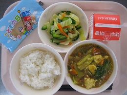 みんなとっても喜んでくれましたとうふのカレー煮は、とうふ、ひき肉、玉ねぎ、にんじん、青梗菜を和風仕立てのカレー味で仕上げます いつもより早く食べ終わった1年生に、「今日は早かったね」と声をかけると、「だって、おいしかったから~」と言ってくれました今週から縦割り班になったので、1年生も給食当番が始まりました。張り切ってがんばってくれています