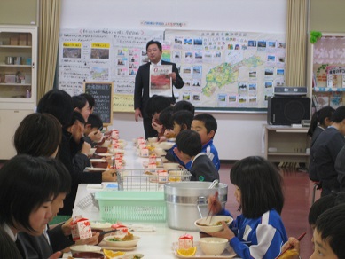 輪島市の農林水産課の延命さんをお招きして、αのめぐみについてのお話をしていただきながら、一緒に給食を食べました