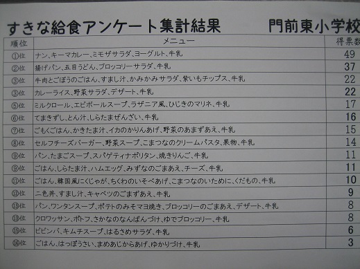 好きな給食アンケート集計結果です。委員会で集計しました。1位は、みんなの予想どおり、ナン&キーマカレーでした。ココア揚げパンもやはり人気です。