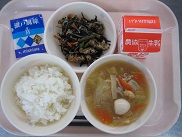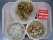 切干大根と豚肉の炒め煮には、豆板醤を少し入れてあります。味が引き締まって美味しくなります。具だくさんのけんちんも、おかわりしている子がいました
