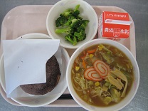今日は久しぶりのラーメンでした。冷凍の中華麺をスチコンで蒸して、一人分ずつに丸めて配食しました。給食当番さんは、丼に麺を盛り付けてから、具入りのスープを注ぎます。味噌味のスープには、キャベツ、もやし、メンマ、かまぼこ、豚肉、コーン、葱が入って、具だくさんでした