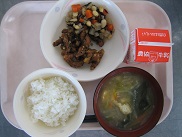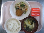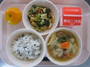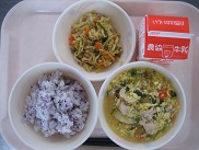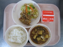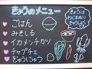 今日は韓国の料理、チャプチェを出しました。春雨に小松菜、卵、牛ひき肉、人参、しいたけ、たけのこを加えて作りました。ごま油がきいていました。イカメンチカツは、とても噛みごたえのあるかみかみメニューです。低学年の子もよくかんで食べていました![]()