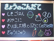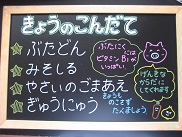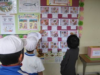 保健・給食委員会で、すきなきゅうしょくアンケートをとります。今日はランチルーム前の掲示板に、16枚の給食写真を貼り出しました。委員会で集計して、人気ランキングを出します