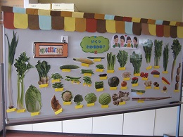ランチルームに、「やさいのなまえあてクイズ」コーナーを作りました。ふだん給食でもよく使うやさいたちです。この機会に、やさいとなかよくなりましょう