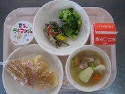 今日はフランス風のメニューを集めてみました。クロワッサンに子どもたちは大喜びでした。魚が苦手という子がちらほらいましたが、まるごと食べると栄養いっぱいだよと声をかけると、がんばって食べていました![]()