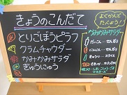 今日は月に一度のかみかみメニューの日でした。かみかみサラダは、旬の地元産大根とにんじん、きゅうりを切り、さっとゆでて、スチームコンベクションで香ばしく焼いたさきいかとともにマヨネーズ、ごま、塩、こしょう、うすくちしょうゆで和えたものです。茶色いさきいかで作るのがポイントです。今日は全員残さず早く食べ終わりました![]()