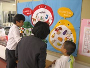 食品の3色分けのタペストリーを買っていただきました。フェルトでひとつひとつ縫ってあり、とてもかわいい食品のマスコットになっています。子どもたちはさっそく3色分けに挑戦していました