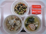 今日はこどもたちに人気の豚肉のかりん揚げでした。揚げた豚肉に甘辛いたれをからめてあります。地場産の小松菜を使ったおひたしもあっさりしておいしかったです