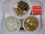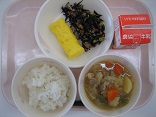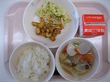 今日は揚げたイカにレモンを使ったたれをからめました。「すっぱい~」と言ってなかなか食べられない子もいましたが、「うめぼしは好きだよ」というので、「うめぼしよりはすっぱくないと思うよ」と一声かけると、残さず全部食べることができました。のっぺい汁のおかわりも行列になっていて、今日も全員残さず食べました