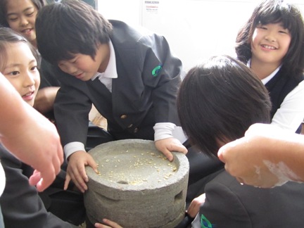 石臼で大豆をひく体験をしました。