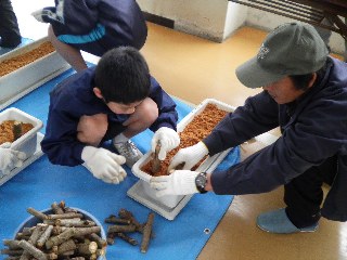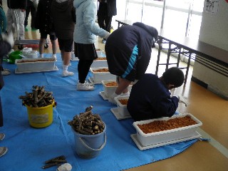 自分たちでタラノキを切り、おがくずの中に植えました。