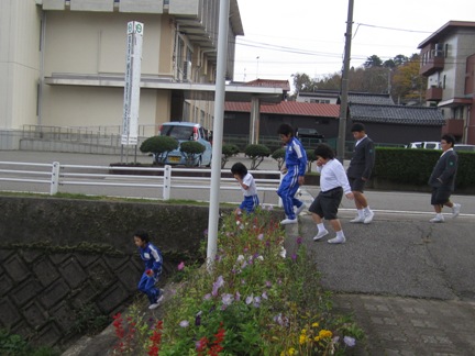 学校の横を通り運動場へ避難しました。