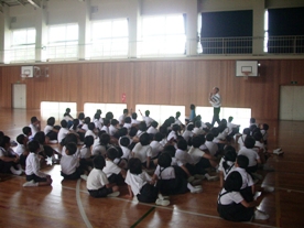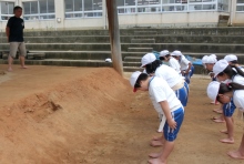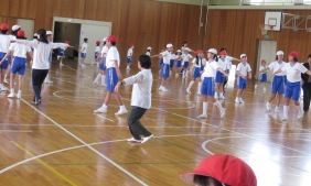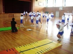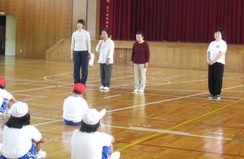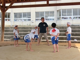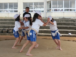 男女共にワンタッチまわしを身に着けて取り組みや礼儀,心構えなどを熱心に見てくださいました。子どもたちの練習を見ていると,こちらも思わず力が入ってしまうような熱い場面もありました。