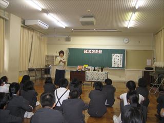 当日は、アリス文庫で活躍されている松田茂子さんを学校にお迎えして、読み聞かせやブックトークをしていただきました。日頃、あまり手に取らない長編小説も含めて『兄弟姉妹』をテーマに楽しく紹介していただき、あらためて読書への意欲を強くもつことができました。