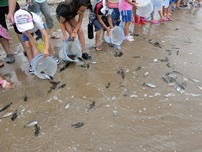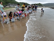 鹿磯海岸にて「ゴミ拾い、ヒラメの稚魚放流」の親子行事を行いました。