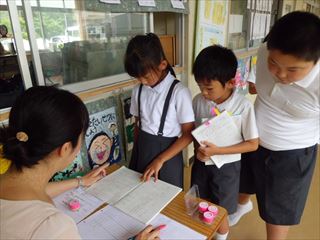 どきどきのノート検定が昼休みにありました。日付やページ、課題とまとめが書いてあるかな?授業で使っているノートを先生に見せて、検定項目がクリアしているかチェックを受けます。