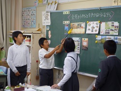 4人は,「全員がトキのことを分かるようになろう!」というテーマを掲げ,本日,「佐渡島&トキ」レポートの報告をしてくれました。交流でいただいてきたたくさんの資料をしっかりと学校にもってきて,その資料や,自分たちで撮影した写真を見せながらの報告でした。発表を聴く5年生たちも,メモを取りながら,時には質問をしながら,真剣に聴いていましたね。トキの成長過程や食べ物,「トキとサギの見分け方」,体重などなど,トキについて学んだことをみんなに一生懸命に伝えようとしている4人の姿は,まるで「トキを守ろう大使」のようでした。今回のこのトキの学習を通して,わたしたちの周りの環境や豊かな「里山里海」についての学習を深めていけたらと思いました。