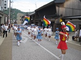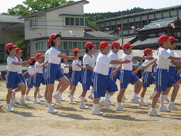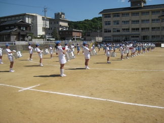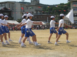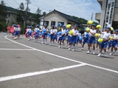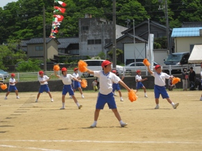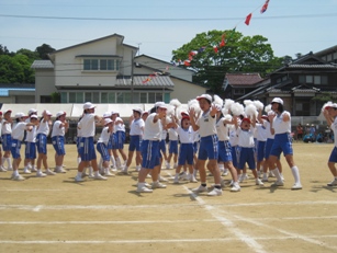 紅組と白組に別れて応援合戦をしました。6年生が中心になって、曲を選び、振り付けをしました。低学年も6年生から踊りをおしえてもらい、一生懸命練習しました。