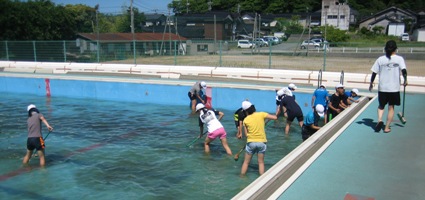 みんなで、ゴシゴシこすりました。きれいなプールで泳ぐために、頑張りました。