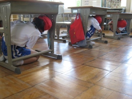 地震が起きたら、机の下などに隠れて、じっとしていよう!