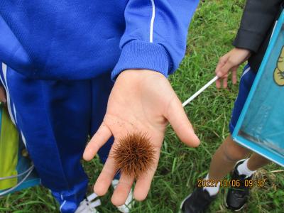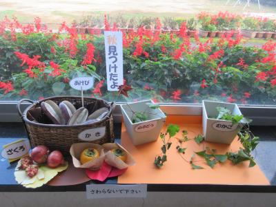 玄関に「秋」のものが飾られました。地域の方からいただいた「あけび、山ぶどう、むかご、柿」と,くしひの森の「ざくろ」です。くしひの森では、「くり」やきれいな落ち葉、秋の虫なども見つけられます。3・4年生は理科で植物や虫の観察をしました。