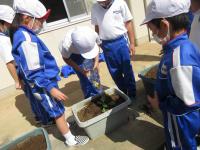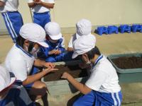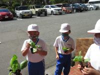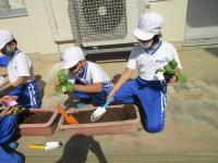 14日の秋晴れのもと,みんなで植えたいと考えた野菜を植えました。野菜を育てるのは2回目です。今回は,キャベツとレタスの苗を植えたり,ラディッシュと大根の種をまいたりしました。種や苗を観察し,においや触った感じ,大きさなど,気付いたことも伝え合いました。最後に水もしっかりとあげることができました。「1学期に学習したことをいかして頑張って育てたい。」と話していました。