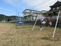 長休みや昼休みには元気に運動場で遊んでいます。ブランコやジャングルジムは低学年の人気遊具です。昨日は運動場でサッカーをしていました。広い運動場です。天気のいい日は、みんな仲良くどんどん外で遊んでください。