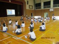 その後,体育館に移動して,土砂災害学習を行いました。子どもたちは,講師のお話を聞き,門前にも水害があったことや、輪島市は土砂発生発生の危険が高い地区であることに驚いていました。また,安全な避難の仕方やハザードマップでの危険な色の順番など,たくさんのことがわかりました。お忙しい中とても分かりやすくお話をしていただき,ありがとうございました。